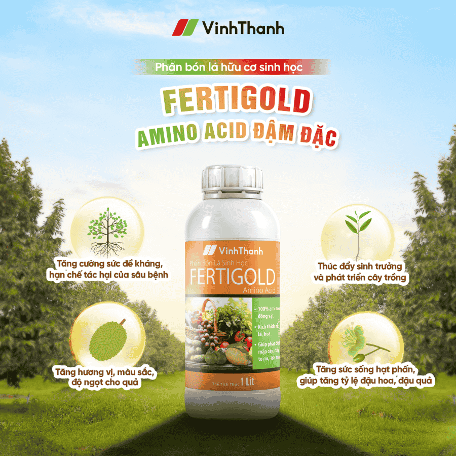 Fertigold - Amino acid đậm đặc cao cấp: Cây khỏe, rễ ra mạnh, lá xanh dày, trái bóng mượt căng tròn