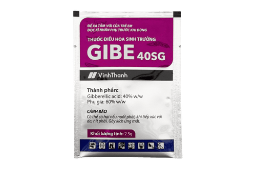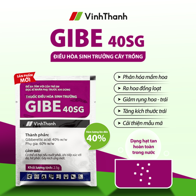 GIBE 40SG là chất điều hòa sinh trưởng chứa Gibberellic Acid (GA₃) hàm lượng cao 40%, dạng hạt tan hoàn toàn trong nước (SG), được sử dụng rộng rãi trên nhiều loại cây ăn quả nhằm điều tiết sinh trưởng, kích thích ra hoa đồng loạt, tăng tỷ lệ đậu trái và nâng cao giá trị thương phẩm nông sản.
